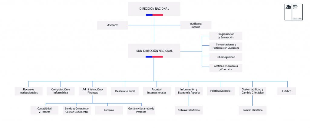 La Dirección Nacional está integrada por el/la Director/a Nacional, quien es el/la Jefe Superior del Servicio y funcionario/a de más alta jerarquía en la Odepa, a quien le corresponderá dirigir, organizar y administrar el servicio; controlarlo y velar por el cumplimiento de sus objetivos; responder de su gestión, asesorando al Ministro/a de Agricultura y a la alta dirección pública en diferentes aspectos del sector silvoagropecuario y rural.