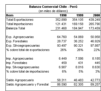 Importaciones Silvoagropecuarias:las importaciones silvoagropecuarias que Chile efectúa desde Perú, ascendieron en el año 2000 a US$ 8,6 millones, menos de 1% del total de compras de productos del sector en el exterior. Esta cifra significa una expansión de 25 % con respecto a 1998. Por otra parte, la relevancia de las importaciones del sector en las importaciones totales desde Perú han declinado desde la firma del ACE, desde un 6 % a un 3 %.