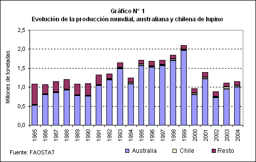 La evolución productiva que se muestra en el gráfico N° 1 permite apreciar que, debido principalmente a una sequía que afectó hace algunos años a las principales zonas productoras de Australia, la cosecha de lupino en este país mostró una fuerte contracción, reduciéndose a casi dos tercios de sus niveles habituales anteriores, aun cuando sigue manteniendo su amplio dominio sobre el resto de los productores. Esta situación se ha reflejado claramente sobre el comportamiento de la producción total de lupino.