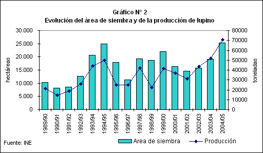 En el país, conforme a las cifras de siembra definitivas entregadas por el INE, el área cultivada con lupino durante la temporada 2004/05 llegó a 25.300 hectáreas, superando en 32,1% al área cultivada con esta especie en la temporada anterior. Se concreta así el tercer incremento consecutivo de las siembras de esta especie, ratificando el claro proceso de desarrollo que viene experimentando en el último tiempo y estableciendo, de paso, un nuevo récord para este cultivo.