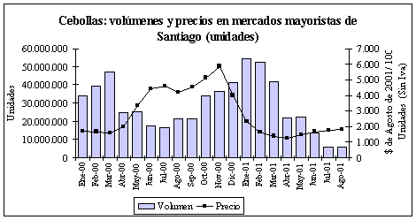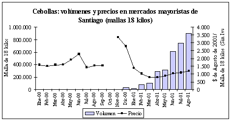 Entre enero y agosto del 2001 se exportaron 34.078 toneladas de cebollas frescas por un valor FOB de 10,6 millones de dólares, lo que significó un crecimiento del 25% en volumen y un 31% en el valor, respecto al mismo período del año anterior.