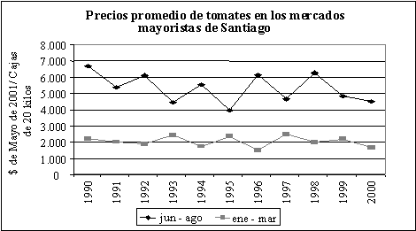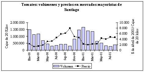 Durante el año 2000 los precios de tomates frescos en el mercado interno fueron inferiores a los del año anterior: la alta producción y una demanda afectada por la difícil situación económica mantuvieron un nivel de precios bajo. Esta situación se revirtió a partir de febrero del 2001, registrándose desde entonces precios superiores a los del año anterior.