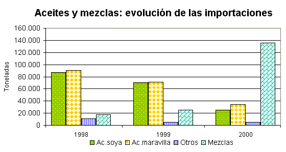 En el primer semestre de 2001 se importaron 76 mil toneladas de aceites vegetales comestibles. Esta cifra incluye la importación de mezclas de aceites, pero excluye los aceites de oliva. Las importaciones de aceites en bruto de soya y de maravilla, que en años anteriores participaban entre 40% y 45% de la cantidad total importada de aceites, se reducen a sólo 4.000 toneladas, en tanto las mezclas de aceites refinados pasan a significar más del 85% de las importaciones totales de aceites comestibles. La estructura de las importaciones varió substancialmente en comparación a la de años anteriores, antes de que las mezclas surgieran como una alternativa para suplir la demanda interna de aceites vegetales. Hace muy pocos años los aceites de soya y de maravilla en bruto representaban alrededor de 40% de las importaciones cada uno, en tanto a los aceites de soya y de maravilla refinado correspondía un 7% cada uno.