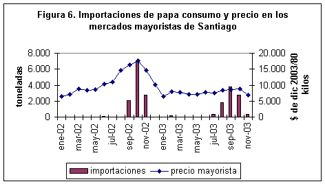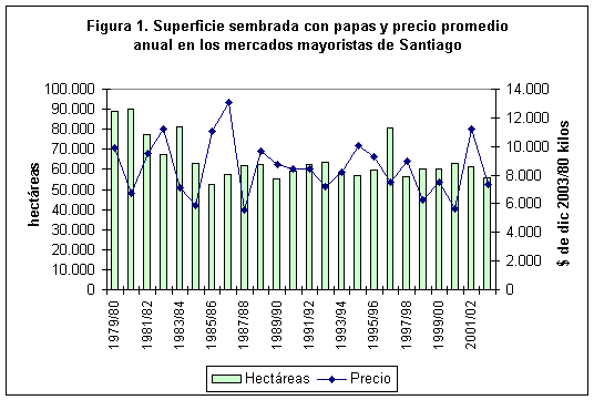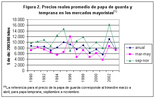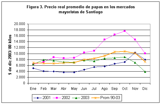 Como se puede ver en las Figuras 2 y 3, la papa temprana alcanzó precios muy altos en el año 2002, lo que provocó un aumento en las intenciones de siembra de los agricultores para el año 2003. Sin embargo, la persistencia de las lluvias hasta muy avanzada la primavera en el sur del país, frustró las siembras de muchos productores y atrasó a otros, lo que se tradujo en otra temporada de baja producción de papa de guarda y la mantención de un nivel de precios alto.