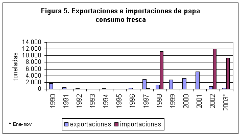 Por otra parte, las exportaciones de papas frescas para consumo, que mostraron un interesante crecimiento entre 1997 y 2001, descendieron fuertemente en los últimos dos años.