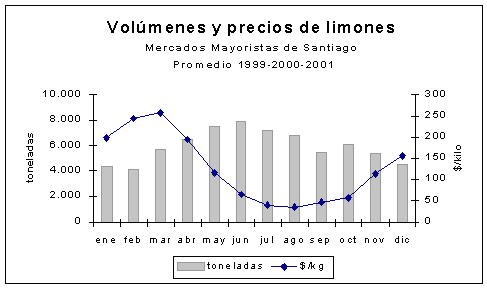 Del análisis del comportamiento de los mercados mayoristas de Santiago se constata el incremento de los volúmenes transados y una tendencia a la baja de los precios promedio. En el quinquenio 1996-2000 se bordearon las 66 mil ton y el precio promedio anual, expresado en moneda de octubre de 2001, fluctuó entre $ 100/kg y $ 150/kg. En el presente año 2001, los volúmenes mensuales señalan que se superarán las 74 mil ton del año 2000 y el precio promedio se acercará al nivel inferior de $ 100/kg alcanzado en 1998. Cabe recordar, sin embargo, que en 1995 apenas llegó a $ 90/kg.