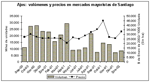 Una vez comenzadas las primeras cosechas de la producción nacional el precio cayó rápidamente, situándose en el mes de noviembre en un valor levemente inferior al del año anterior. A partir de enero el precio ha subido en el mercado interno. Cabe señalar que la alta proporción de ajo chino en el mercado hace difícil la guarda, pues este tipo de ajo no es susceptible de almacenarse por más de tres meses. Por esta razón la liquidación de las cosechas es relativamente rápida y sólo los productores de ajo rosado pueden guardar su producción para esperar mejores precios.