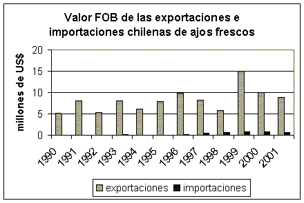 Las ventas al exterior de ajos se han ido concentrando en México y han disminuido en otros mercados como EE.UU. y los países latinoamericanos. Las importaciones de EE.UU. en el año 1998 y 1999 superaron los 40 millones de dólares, disminuyendo en el año 2000 a 27 millones, lo que ha provocado menores ventas para Chile y los principales proveedores de ese país, que son México, Argentina y España.