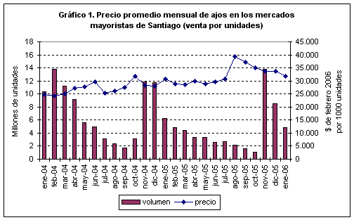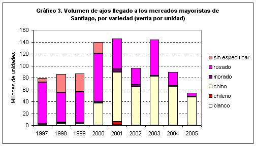 En el mercado interno, el ajo tipo chino (tanto el producido en el país como el importado) ha venido desplazando a otras variedades. Como se ve en el gráfico 3, hasta el año 2000 el ajo rosado predominaba en los mercados mayoristas de Santiago; sin embargo, a partir de entonces el ajo tipo chino se ha impuesto como la variedad de mayor volumen comercializado (el tipo denominado «chileno» corresponde a bajos calibres de ajo rosado). El 100% de los ajos vendidos en 2005 bajo la modalidad de venta por kilos correspondió al tipo chino: una variedad blanca, de corta vida de poscosecha y que en general obtiene mayores calibres y rendimientos más altos. El ajo rosado tiene la cutícula de color rojizo, suele presentar menores calibres y tiene una larga vida poscosecha.