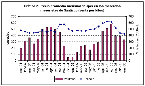 Desde que comenzó a ser importante la presencia de ajo importado en el mercado interno, esto es, desde el año 2000, la venta por kilos empezó a ser significativa en los mercados mayoristas. Sin embargo, las ventas en esta forma también disminuyeron en 2005: en el año 2004 se vendieron 4.269 toneladas, mientras que en 2005 se llegó a 3.735 toneladas. Sus precios también mostraron un aumento en el año 2005, que en promedio fue de 13%.