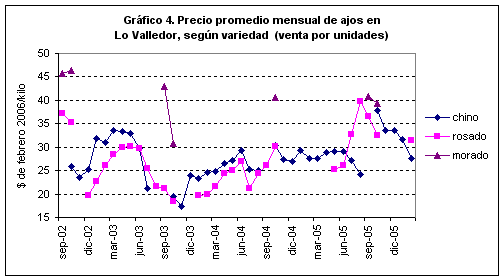 Como se ve en el gráfico 4, no existen diferencias importantes en los precios de estas variedades. Sólo el ajo morado, que es producido en Arica, en los valles de Lluta y Azapa, y cuyos volúmenes de venta son muy inferiores, presenta un precio notoriamente más alto.