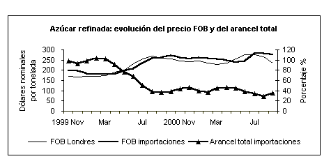 El azúcar refinada, que significa cerca del 99% de las importaciones de azúcar, está afecta al sistema de banda de precios y, por lo tanto, a derechos específicos, cuando los precios internacionales son inferiores al valor FOB del piso de la banda de precios. Esto significó que los derechos específicos que se aplicaron a las importaciones subieron de US$ 130/ton promedio en 1998, a US$ 171/ton en 1999, para luego alcanzar a US$ 136/ton en 2000 y US$ 92/ton en 2001.