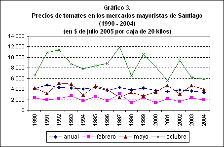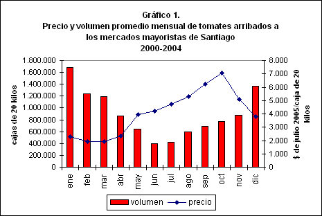 La superficie de tomates se concentra en la zona central, cuya oferta se produce entre diciembre y abril. En esta época, como se observa en el gráfico 1, se registran los precios más bajos en los mercados mayoristas de la ciudad de Santiago.