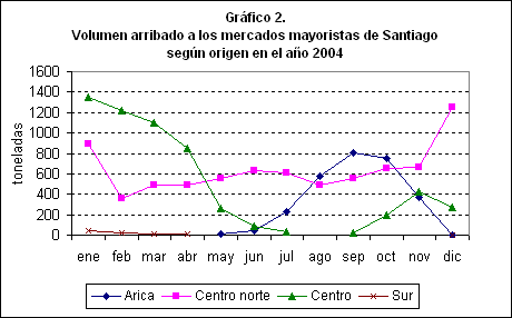 El norte del país y la producción de invernaderos abastecen el mercado durante el resto del año. En esta época se produce la menor oferta y los precios más altos. En el gráfico 2 se muestran los volúmenes arribados a los mercados mayoristas según origen durante el año 2004, y se puede observar que la producción de Arica tiene gran presencia en el mercado de la zona central entre agosto y noviembre, mientras que la producción del centro norte del país, que comprende las regiones III a V, ocupa un espacio importante durante todo el año, siendo especialmente relevante su presencia entre mayo y julio, lapso en el cual la oferta proviene de la producción bajo invernadero.
