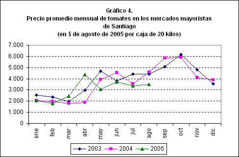 Los precios del mes de octubre, representativos de la producción temprana de primavera, muestran la mayor variación y una tendencia a la baja. Esto se debe al aumento de la superficie bajo invernadero y a la mayor producción del norte del país, principalmente de Arica, a la que se suma la reciente producción de Copiapó, que logra, a bajo costo, un producto con buena maduración.