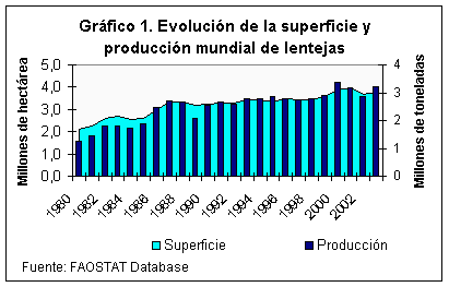 Según antecedentes de la FAO, desde 1980 las siembras de lentejas en el mundo han experimentado un crecimiento bastante persistente, hasta llegar a cubrir un promedio de 3,77 millones de hectáreas durante los últimos cinco años.