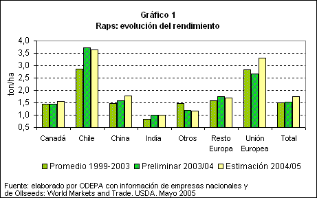 En la temporada 2004/05 se sembraron 12.400 hectáreas de raps canola. Esta superficie, que es el doble del área sembrada con raps en el año anterior y que confirma el renacimiento del cultivo después de su casi desaparición hace unos pocos años, es consecuencia de la existencia de a lo menos tres poderes compradores que han mantenido estrecha vinculación con los productores del grano y que anunciaron, por contrato, un precio en dólares por tonelada al momento de la siembra. La existencia de este tipo de contratos de compraventa se ha facilitado por la entrada indirecta de la industria acuícola en la demanda de raps canola, como fuente de proteínas y lípidos para sus alimentos.