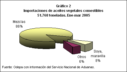 En relación a las importaciones de aceites vegetales comestibles, en 2004 y en comparación a 2003 (Cuadro N° 2), se observó que aumentaron en casi 19.000 toneladas, para alcanzar a 224.000 toneladas de aceites refinados, por un valor CIF de 164 millones de dólares. Al igual que en años anteriores, las mezclas de aceites constituyeron casi el 100% de las importaciones. Aun cuando entre 2003 y 2004 casi todos los aceites experimentaron alzas en sus precios, el aceite de soya en bruto (para refinar en el país) subió de 538 a 614 dólares por tonelada en 2004, mientras que las mezclas refinadas (envasadas y que representan el 60% de las importaciones de mezclas), subieron de 692 a 761 dólares por tonelada.