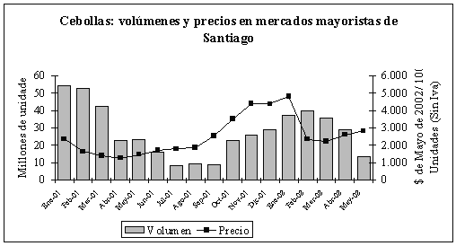 El alto precio de la cebolla temprana a fines del año 2000 cayó fuertemente a partir de enero de 2001, con las primeras cosechas de la cebolla de guarda. El bajo nivel de precios se mantuvo durante el resto del año, lo que desincentivó las siembras de cebolla de guarda para la presente temporada. Esto se observa en los menores volúmenes arribados a los mercados mayoristas de Santiago: entre septiembre y mayo se han transado 241 millones de unidades, un 27% menos que en el mismo período de la temporada anterior.