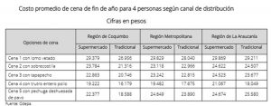 Los precios promedio para estos menús varían entre los 15 mil y 30 pesos, según los productos y tipo de canal de distribución: supermercadista y tradicional que incluye ferias libres, carnicerías y panaderías (ver cuadros adjuntos).